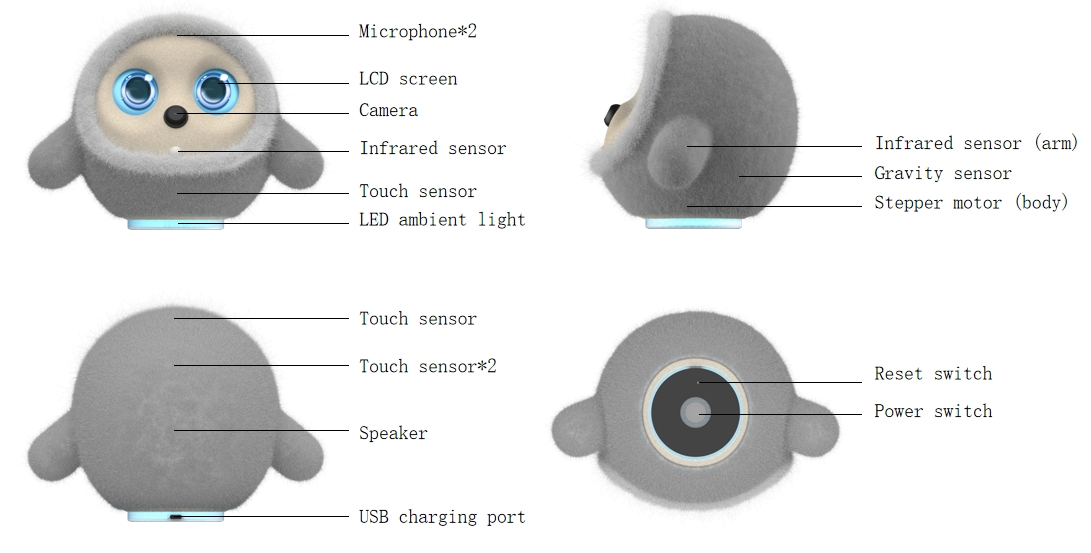 | Sensor táctil | Los módulos táctiles distribuidos (cabeza, espalda, abdomen) se utilizan para detectar caricias y palmaditas (como "tocar la cabeza" y "hacer cosquillas"). |