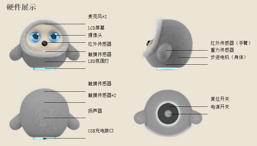 Diseño de enfoque interactivo: cuenta con una pantalla LCD de alta definición de 4,28 pulgadas como sus "ojos", que admite una visualización heterogénea de pantalla dual y sirve como ventana principal para transmitir emociones centrales e información de estado.