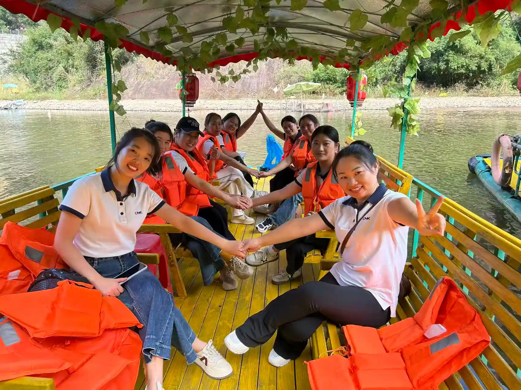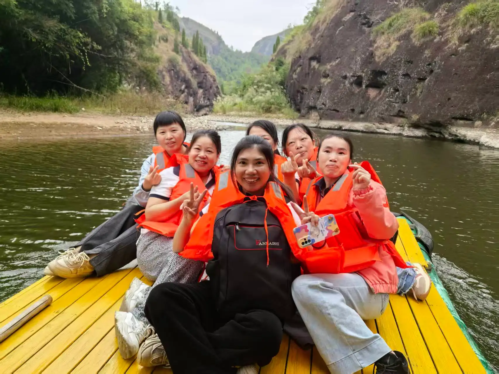 El horario de la tarde fue más tranquilo. Todo el equipo abordó balsas de bambú para realizar un crucero panorámico a través de diez li de impresionantes paisajes. Deslizándose entre las montañas Danxia y las aguas color esmeralda, admiraron el pintoresco paisaje donde "las montañas verdes se alzan como cejas oscuras y las aguas claras fluyen como la seda". A lo largo de la ruta acuática de 3,2 kilómetros, todos se relajaron, sumergiéndose en la tranquilidad y la belleza de la naturaleza.