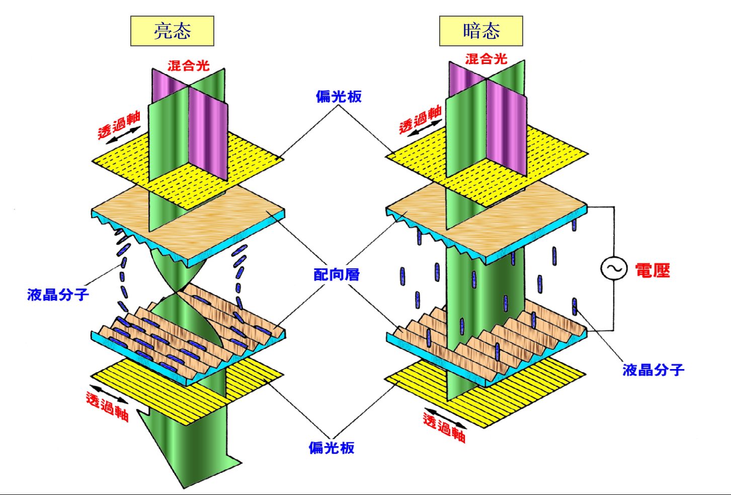 En el estado brillante (estado sin visualización), las moléculas de cristal líquido mantienen una disposición torcida regular de 90 grados. La luz incidente se polariza después de pasar por el eje de transmisión del polarizador frontal. A medida que esta luz polarizada pasa a través de la capa de cristal líquido, su dirección de polarización gira 90 grados junto con la estructura de torsión molecular, alineándose con el eje óptico del polarizador trasero y transmitiéndose para formar el estado brillante.