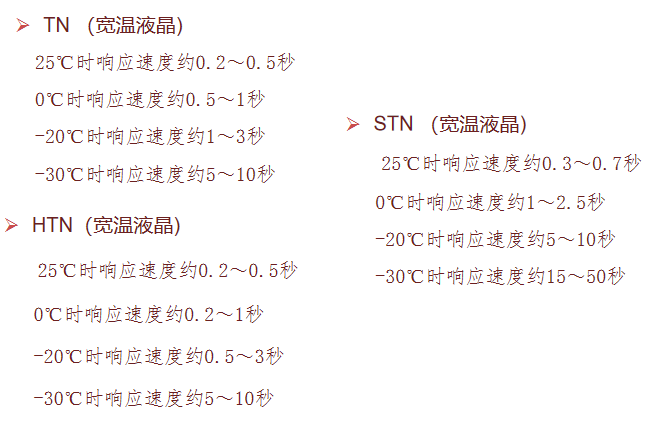 La velocidad de respuesta, incluido el tiempo de subida (Tr) y el tiempo de caída (Tf), mide la rapidez con la que una pantalla LCD responde a las señales. Las propiedades reológicas de los cristales líquidos determinan su fuerte dependencia de la temperatura: cuanto menor es la temperatura, mayor es la viscosidad del cristal líquido y más lenta es la velocidad de respuesta.